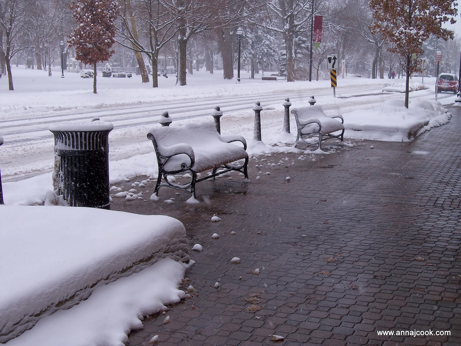 There wasn't enough traffic out and about to keep the snow off the roads. This is a view across the intersection of River and 10th, looking toward Centennial Park (dedicated in 1876).
