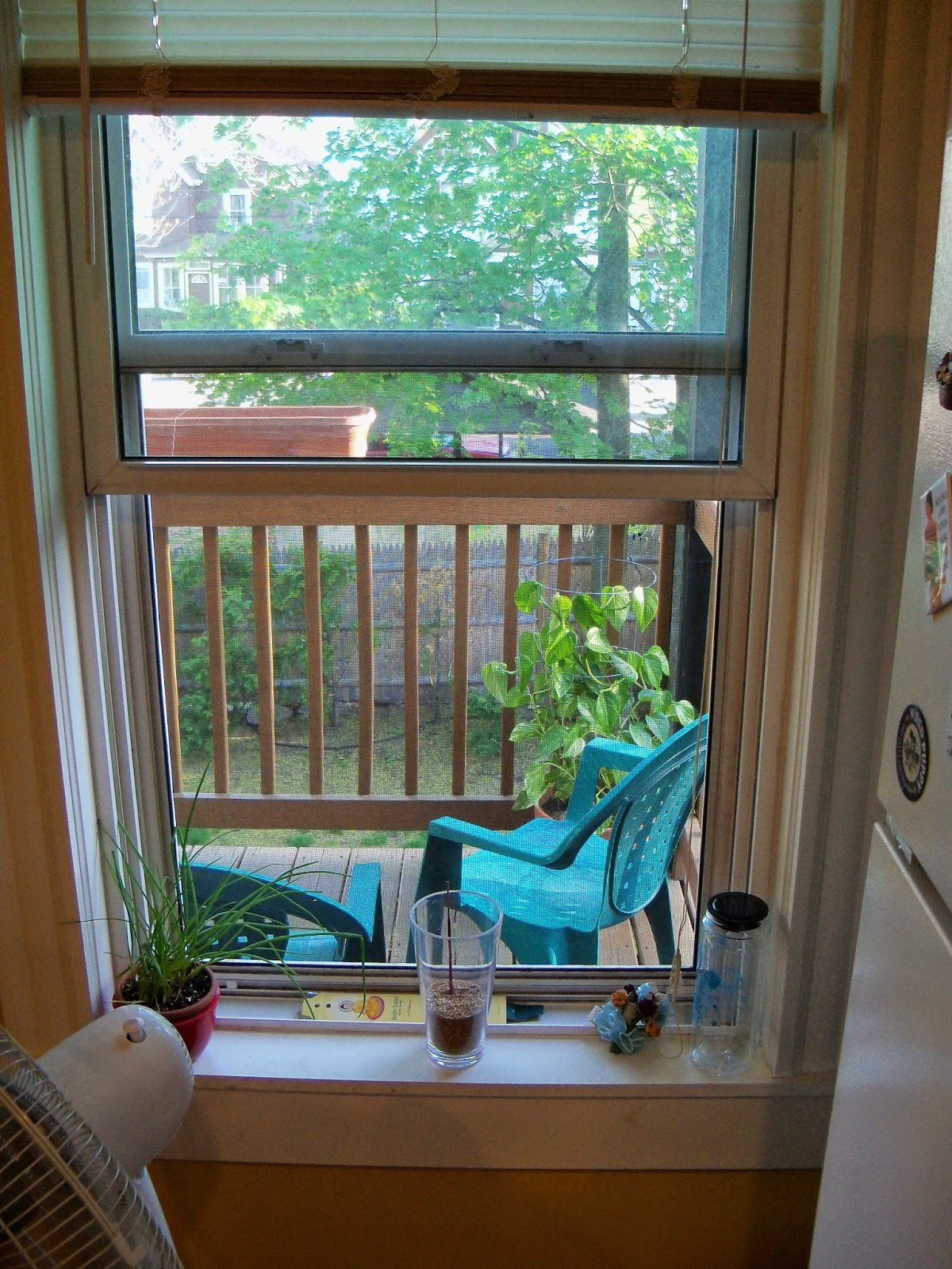 We share our second-floor porch with the next-door neighbors and their cat, Jelly, whom Gerry and Teazle have only met through the window so far. Our plants are very happy outside, and we can dry out laundry out there as well! There are five huge maple trees shading the back lawn (And sheltering our house from the worst of the summer sun.